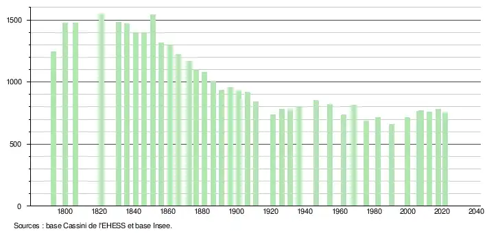 L'évolution du nombre d'habitants est connue à travers les recensements de la population effectués dans la commune depuis 1793. Pour les communes de moins de 10 000 habitants, une enquête de recensement portant sur toute la population est réalisée tous les cinq ans, les populations légales des années intermédiaires étant quant à elles estimées par interpolation ou extrapolation[24]. Pour la commune, le premier recensement exhaustif entrant dans le cadre du nouveau dispositif a été réalisé en 2007[25].