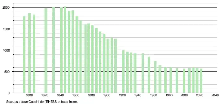 | L'évolution du nombre d'habitants est connue à travers les recensements de la population effectués dans la commune depuis 1793. Pour les communes de moins de 10 000 habitants, une enquête de recensement portant sur toute la population est réalisée tous les cinq ans, les populations légales des années intermédiaires étant quant à elles estimées par interpolation ou extrapolation[32]. Pour la commune, le premier recensement exhaustif entrant dans le cadre du nouveau dispositif a été réalisé en 2006[33]. En 2021, la commune comptait 570 habitants[Note 6], en diminution de 1,89 % par rapport à 2015 (Gers : +0,79 %, France hors Mayotte : +1,84 %). |