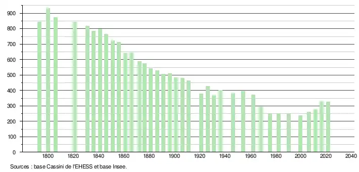 L'évolution du nombre d'habitants est connue à travers les recensements de la population effectués dans la commune depuis 1793. Pour les communes de moins de 10 000 habitants, une enquête de recensement portant sur toute la population est réalisée tous les cinq ans, les populations légales des années intermédiaires étant quant à elles estimées par interpolation ou extrapolation[21]. Pour la commune, le premier recensement exhaustif entrant dans le cadre du nouveau dispositif a été réalisé en 2006[22].