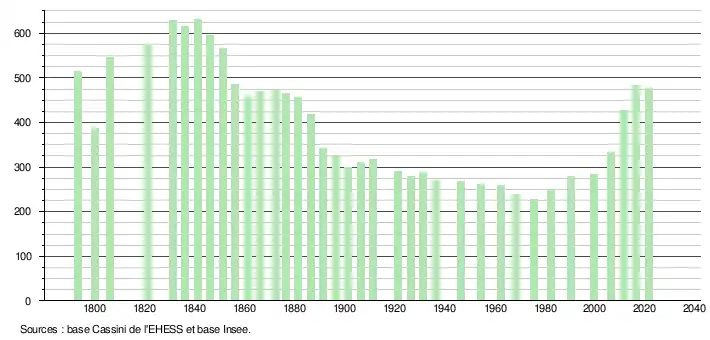 L'évolution du nombre d'habitants est connue à travers les recensements de la population effectués dans la commune depuis 1793. Pour les communes de moins de 10 000 habitants, une enquête de recensement portant sur toute la population est réalisée tous les cinq ans, les populations légales des années intermédiaires étant quant à elles estimées par interpolation ou extrapolation[34]. Pour la commune, le premier recensement exhaustif entrant dans le cadre du nouveau dispositif a été réalisé en 2006[35].