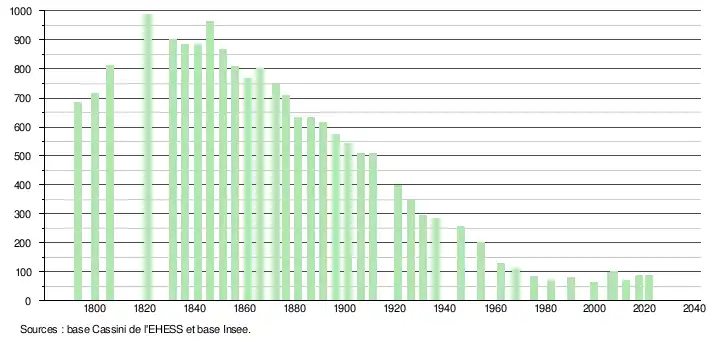 L'évolution du nombre d'habitants est connue à travers les recensements de la population effectués dans la commune depuis 1793. Pour les communes de moins de 10 000 habitants, une enquête de recensement portant sur toute la population est réalisée tous les cinq ans, les populations légales des années intermédiaires étant quant à elles estimées par interpolation ou extrapolation[34]. Pour la commune, le premier recensement exhaustif entrant dans le cadre du nouveau dispositif a été réalisé en 2007[35].