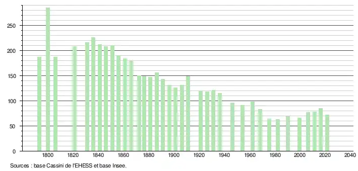 L'évolution du nombre d'habitants est connue à travers les recensements de la population effectués dans la commune depuis 1793. Pour les communes de moins de 10 000 habitants, une enquête de recensement portant sur toute la population est réalisée tous les cinq ans, les populations légales des années intermédiaires étant quant à elles estimées par interpolation ou extrapolation[28]. Pour la commune, le premier recensement exhaustif entrant dans le cadre du nouveau dispositif a été réalisé en 2006[29].