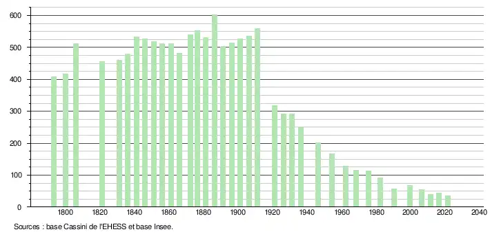 L'évolution du nombre d'habitants est connue à travers les recensements de la population effectués dans la commune depuis 1793. Pour les communes de moins de 10 000 habitants, une enquête de recensement portant sur toute la population est réalisée tous les cinq ans, les populations légales des années intermédiaires étant quant à elles estimées par interpolation ou extrapolation[21]. Pour la commune, le premier recensement exhaustif entrant dans le cadre du nouveau dispositif a été réalisé en 2006[22].