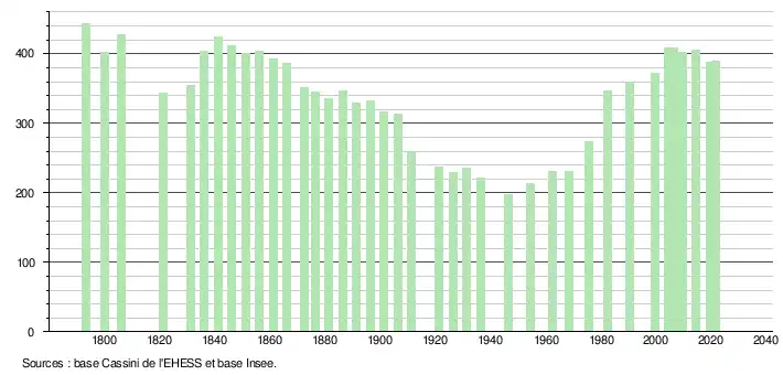 L'évolution du nombre d'habitants est connue à travers les recensements de la population effectués dans la commune depuis 1793. Pour les communes de moins de 10 000 habitants, une enquête de recensement portant sur toute la population est réalisée tous les cinq ans, les populations légales des années intermédiaires étant quant à elles estimées par interpolation ou extrapolation[22]. Pour la commune, le premier recensement exhaustif entrant dans le cadre du nouveau dispositif a été réalisé en 2004[23].