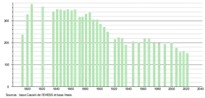 L'évolution du nombre d'habitants est connue à travers les recensements de la population effectués dans la commune depuis 1793. Pour les communes de moins de 10 000 habitants, une enquête de recensement portant sur toute la population est réalisée tous les cinq ans, les populations légales des années intermédiaires étant quant à elles estimées par interpolation ou extrapolation[14]. Pour la commune, le premier recensement exhaustif entrant dans le cadre du nouveau dispositif a été réalisé en 2006[15].