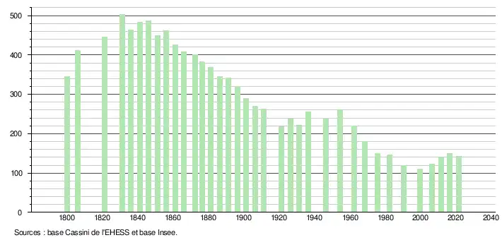 L'évolution du nombre d'habitants est connue à travers les recensements de la population effectués dans la commune depuis 1800. Pour les communes de moins de 10 000 habitants, une enquête de recensement portant sur toute la population est réalisée tous les cinq ans, les populations légales des années intermédiaires étant quant à elles estimées par interpolation ou extrapolation[20]. Pour la commune, le premier recensement exhaustif entrant dans le cadre du nouveau dispositif a été réalisé en 2006[21].