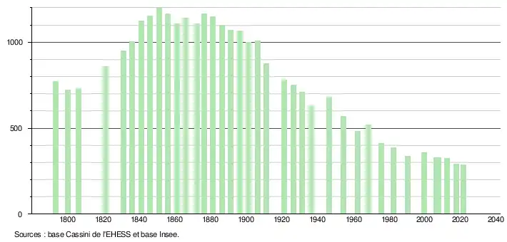 L'évolution du nombre d'habitants est connue à travers les recensements de la population effectués dans la commune depuis 1793. Pour les communes de moins de 10 000 habitants, une enquête de recensement portant sur toute la population est réalisée tous les cinq ans, les populations légales des années intermédiaires étant quant à elles estimées par interpolation ou extrapolation[15]. Pour la commune, le premier recensement exhaustif entrant dans le cadre du nouveau dispositif a été réalisé en 2007[16].