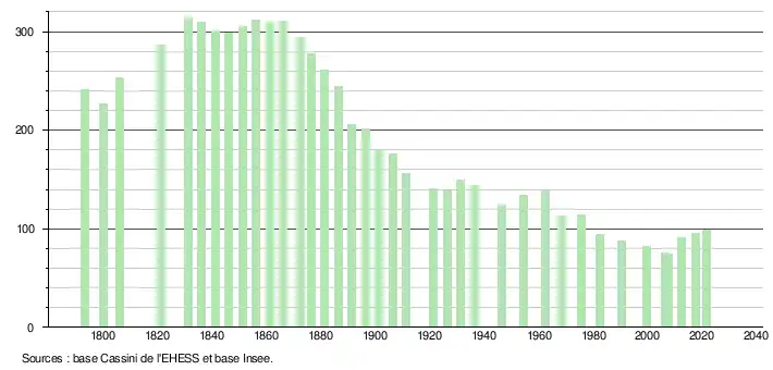 L'évolution du nombre d'habitants est connue à travers les recensements de la population effectués dans la commune depuis 1793. Pour les communes de moins de 10 000 habitants, une enquête de recensement portant sur toute la population est réalisée tous les cinq ans, les populations légales des années intermédiaires étant quant à elles estimées par interpolation ou extrapolation[19]. Pour la commune, le premier recensement exhaustif entrant dans le cadre du nouveau dispositif a été réalisé en 2007[20].