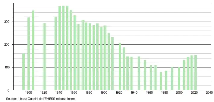 L'évolution du nombre d'habitants est connue à travers les recensements de la population effectués dans la commune depuis 1793. Pour les communes de moins de 10 000 habitants, une enquête de recensement portant sur toute la population est réalisée tous les cinq ans, les populations légales des années intermédiaires étant quant à elles estimées par interpolation ou extrapolation[13]. Pour la commune, le premier recensement exhaustif entrant dans le cadre du nouveau dispositif a été réalisé en 2006[14].