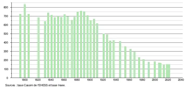 L'évolution du nombre d'habitants est connue à travers les recensements de la population effectués dans la commune depuis 1793. Pour les communes de moins de 10 000 habitants, une enquête de recensement portant sur toute la population est réalisée tous les cinq ans, les populations légales des années intermédiaires étant quant à elles estimées par interpolation ou extrapolation[14]. Pour la commune, le premier recensement exhaustif entrant dans le cadre du nouveau dispositif a été réalisé en 2008[15].