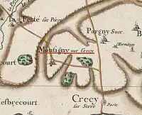 La carte de Cassini montre qu'au XVIIIe siècle, Montigny-sur-Crécy est une paroisse située sur le chemin qui conduit à Crécy-sur-Serre.