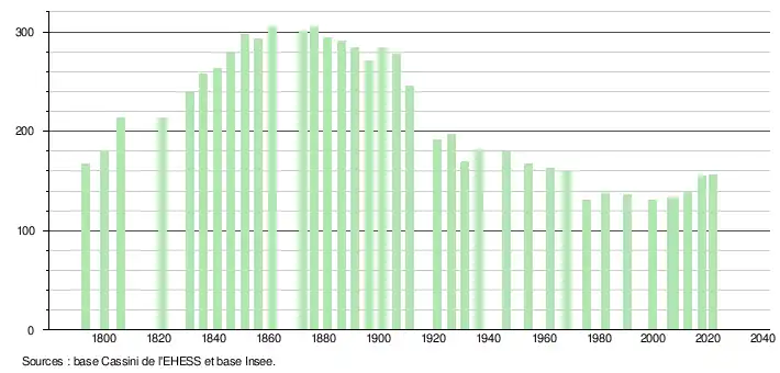 L'évolution du nombre d'habitants est connue à travers les recensements de la population effectués dans la commune depuis 1793. Pour les communes de moins de 10 000 habitants, une enquête de recensement portant sur toute la population est réalisée tous les cinq ans, les populations légales des années intermédiaires étant quant à elles estimées par interpolation ou extrapolation[22]. Pour la commune, le premier recensement exhaustif entrant dans le cadre du nouveau dispositif a été réalisé en 2007[23].
