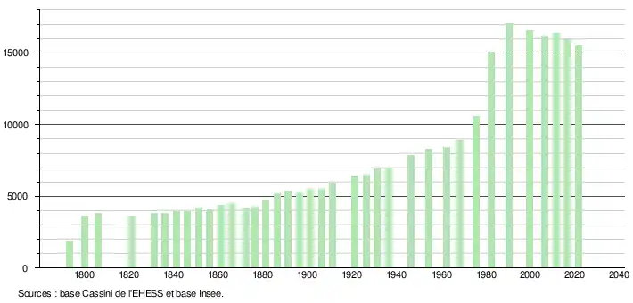 - Par convention dans Wikipédia, le principe a été retenu de n’afficher dans le tableau des recensements et le graphique, pour les populations légales postérieures à 1999, que les populations correspondant à une enquête exhaustive de recensement pour les communes de moins de 10 000 habitants, et que les populations des années 2006, 2011, 2016, etc. pour les communes de plus de 10 000 habitants, ainsi que la dernière population légale publiée par l’Insee pour l'ensemble des communes.