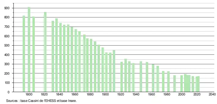 | L'évolution du nombre d'habitants est connue à travers les recensements de la population effectués dans la commune depuis 1793. Pour les communes de moins de 10 000 habitants, une enquête de recensement portant sur toute la population est réalisée tous les cinq ans, les populations légales des années intermédiaires étant quant à elles estimées par interpolation ou extrapolation[31]. Pour la commune, le premier recensement exhaustif entrant dans le cadre du nouveau dispositif a été réalisé en 2004[32]. En 2021, la commune comptait 170 habitants[Note 8], en augmentation de 1,8 % par rapport à 2015 (Tarn-et-Garonne : +3,17 %, France hors Mayotte : +1,84 %). |