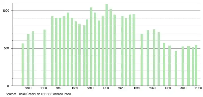 L'évolution du nombre d'habitants est connue à travers les recensements de la population effectués dans la commune depuis 1793. Pour les communes de moins de 10 000 habitants, une enquête de recensement portant sur toute la population est réalisée tous les cinq ans, les populations légales des années intermédiaires étant quant à elles estimées par interpolation ou extrapolation[6]. Pour la commune, le premier recensement exhaustif entrant dans le cadre du nouveau dispositif a été réalisé en 2007[7].