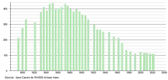 L'évolution du nombre d'habitants est connue à travers les recensements de la population effectués dans la commune depuis 1793. Pour les communes de moins de 10 000 habitants, une enquête de recensement portant sur toute la population est réalisée tous les cinq ans, les populations légales des années intermédiaires étant quant à elles estimées par interpolation ou extrapolation[32]. Pour la commune, le premier recensement exhaustif entrant dans le cadre du nouveau dispositif a été réalisé en 2005[33].