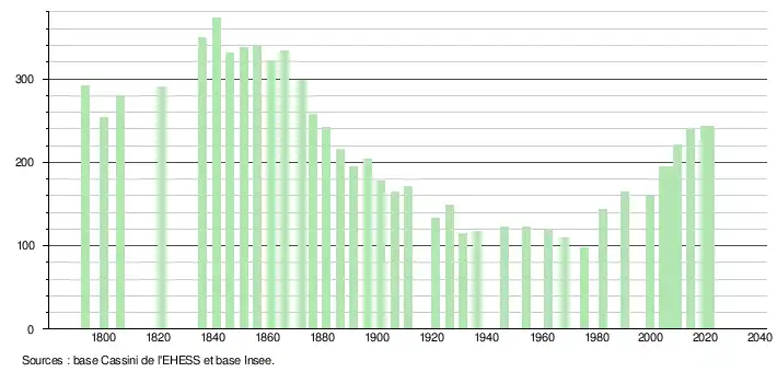 L'évolution du nombre d'habitants est connue à travers les recensements de la population effectués dans la commune depuis 1793. Pour les communes de moins de 10 000 habitants, une enquête de recensement portant sur toute la population est réalisée tous les cinq ans, les populations légales des années intermédiaires étant quant à elles estimées par interpolation ou extrapolation[13]. Pour la commune, le premier recensement exhaustif entrant dans le cadre du nouveau dispositif a été réalisé en 2004[14].