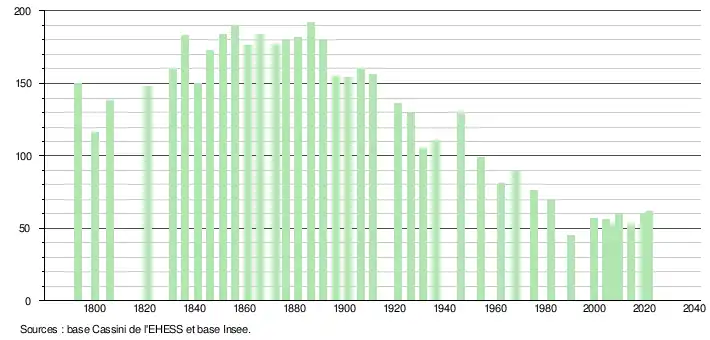 L'évolution du nombre d'habitants est connue à travers les recensements de la population effectués dans la commune depuis 1793. Pour les communes de moins de 10 000 habitants, une enquête de recensement portant sur toute la population est réalisée tous les cinq ans, les populations légales des années intermédiaires étant quant à elles estimées par interpolation ou extrapolation[16]. Pour la commune, le premier recensement exhaustif entrant dans le cadre du nouveau dispositif a été réalisé en 2004[17].