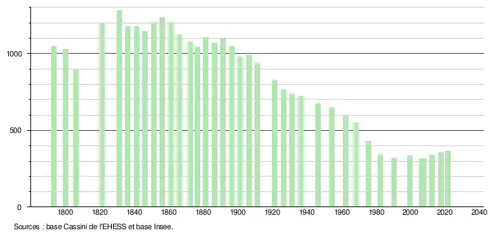 L'évolution du nombre d'habitants est connue à travers les recensements de la population effectués dans la commune depuis 1793. Pour les communes de moins de 10 000 habitants, une enquête de recensement portant sur toute la population est réalisée tous les cinq ans, les populations légales des années intermédiaires étant quant à elles estimées par interpolation ou extrapolation[20]. Pour la commune, le premier recensement exhaustif entrant dans le cadre du nouveau dispositif a été réalisé en 2007[21].