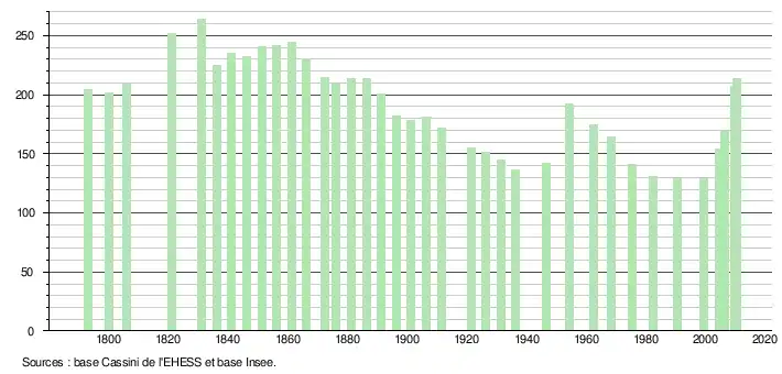 L'évolution du nombre d'habitants est connue à travers les recensements de la population effectués dans la commune depuis 1793. À partir du , les populations légales des communes sont publiées annuellement dans le cadre d'un recensement qui repose désormais sur une collecte d'information annuelle, concernant successivement tous les territoires communaux au cours d'une période de cinq ans. Pour les communes de moins de 10 000 habitants, une enquête de recensement portant sur toute la population est réalisée tous les cinq ans, les populations légales des années intermédiaires étant quant à elles estimées par interpolation ou extrapolation[30]. Pour la commune, le premier recensement exhaustif entrant dans le cadre du nouveau dispositif a été réalisé en [31],[Note 1].
