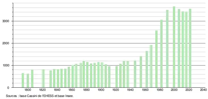 L'évolution du nombre d'habitants est connue à travers les recensements de la population effectués dans la commune depuis 1793. Pour les communes de moins de 10 000 habitants, une enquête de recensement portant sur toute la population est réalisée tous les cinq ans, les populations légales des années intermédiaires étant quant à elles estimées par interpolation ou extrapolation[27]. Pour la commune, le premier recensement exhaustif entrant dans le cadre du nouveau dispositif a été réalisé en 2006[28].