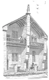 « Il arrivait aussi que deux maisons étaient accolées avec mur mitoyen intermédiaire, comble unique à deux égouts sur deux ruelles latérales. On voit encore dans la petite ville de Montréal (Yonne) quelques maisons construites d’après ce système, et une, entre autres, proche de la porte du côté d’Avallon, qui est assez bien conservée. La fig. 6 en reproduit le plan. Cette maison double paraît remonter aux premières années du XIIIe siècle.[25] »