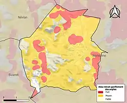 Le retrait-gonflement des sols argileux est susceptible d'engendrer des dommages importants aux bâtiments en cas d’alternance de périodes de sécheresse et de pluie. 84,6 % de la superficie communale est en aléa moyen ou fort (75,2 % au niveau départemental et 48,5 % au niveau national). Sur les 622 bâtiments dénombrés sur la commune en 2019, 621 sont en aléa moyen ou fort, soit 100 %, à comparer aux 94 % au niveau départemental et 54 % au niveau national. Une cartographie de l'exposition du territoire national au retrait gonflement des sols argileux est disponible sur le site du BRGM[24],[Carte 3].