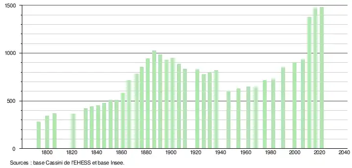 | L'évolution du nombre d'habitants est connue à travers les recensements de la population effectués dans la commune depuis 1793. Pour les communes de moins de 10 000 habitants, une enquête de recensement portant sur toute la population est réalisée tous les cinq ans, les populations légales des années intermédiaires étant quant à elles estimées par interpolation ou extrapolation[31]. Pour la commune, le premier recensement exhaustif entrant dans le cadre du nouveau dispositif a été réalisé en 2006[32]. En 2021, la commune comptait 1 480 habitants[Note 6], en augmentation de 1,16 % par rapport à 2015 (Aude : +2,47 %, France hors Mayotte : +1,84 %). |