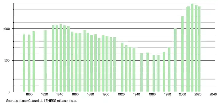 L'évolution du nombre d'habitants est connue à travers les recensements de la population effectués dans la commune depuis 1793. Pour les communes de moins de 10 000 habitants, une enquête de recensement portant sur toute la population est réalisée tous les cinq ans, les populations légales des années intermédiaires étant quant à elles estimées par interpolation ou extrapolation[21]. Pour la commune, le premier recensement exhaustif entrant dans le cadre du nouveau dispositif a été réalisé en 2007[22].