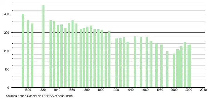 L'évolution du nombre d'habitants est connue à travers les recensements de la population effectués dans la commune depuis 1793. Pour les communes de moins de 10 000 habitants, une enquête de recensement portant sur toute la population est réalisée tous les cinq ans, les populations légales des années intermédiaires étant quant à elles estimées par interpolation ou extrapolation[21]. Pour la commune, le premier recensement exhaustif entrant dans le cadre du nouveau dispositif a été réalisé en 2004[22].