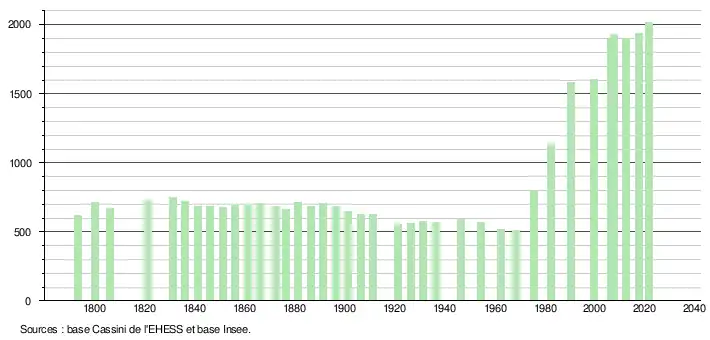 L'évolution du nombre d'habitants est connue à travers les recensements de la population effectués dans la commune depuis 1793. Pour les communes de moins de 10 000 habitants, une enquête de recensement portant sur toute la population est réalisée tous les cinq ans, les populations légales des années intermédiaires étant quant à elles estimées par interpolation ou extrapolation[19]. Pour la commune, le premier recensement exhaustif entrant dans le cadre du nouveau dispositif a été réalisé en 2007[20].