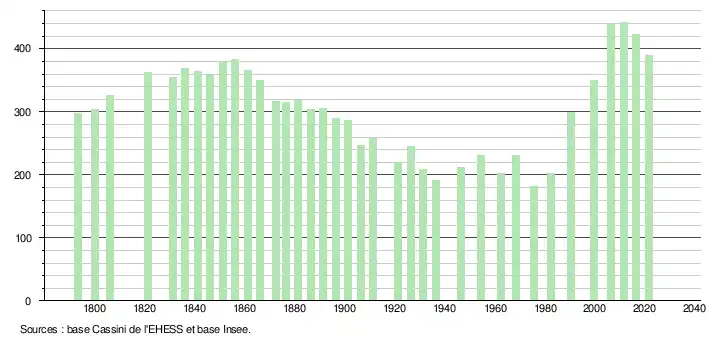L'évolution du nombre d'habitants est connue à travers les recensements de la population effectués dans la commune depuis 1793. Pour les communes de moins de 10 000 habitants, une enquête de recensement portant sur toute la population est réalisée tous les cinq ans, les populations légales des années intermédiaires étant quant à elles estimées par interpolation ou extrapolation[21]. Pour la commune, le premier recensement exhaustif entrant dans le cadre du nouveau dispositif a été réalisé en 2006[22].