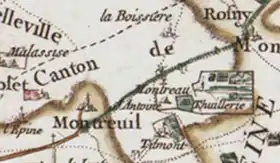 Le village du Moyen Âge s'est initialement implanté dans un talweg marquant le changement de direction du plateau de Montreuil (bifurcation vers le sud). C'est là que se situent actuellement le centre-ville et la mairie. Le plateau de Malassise[4], du nom d'un ancien hameau vigneron situé au nord-ouest du village de Montreuil (tel qu'il apparaît sur la carte d'État-Major des Environs de Paris de 1818-1824), culmine sur la commune actuelle en trois petites buttes. Sa pente joue un rôle important dans la division de la ville en Haut-Montreuil et Bas-Montreuil.