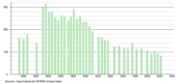L'évolution du nombre d'habitants est connue à travers les recensements de la population effectués dans la commune depuis 1793. Pour les communes de moins de 10 000 habitants, une enquête de recensement portant sur toute la population est réalisée tous les cinq ans, les populations légales des années intermédiaires étant quant à elles estimées par interpolation ou extrapolation[15]. Pour la commune, le premier recensement exhaustif entrant dans le cadre du nouveau dispositif a été réalisé en 2006[16].