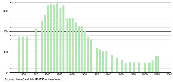L'évolution du nombre d'habitants est connue à travers les recensements de la population effectués dans la commune depuis 1793. Pour les communes de moins de 10 000 habitants, une enquête de recensement portant sur toute la population est réalisée tous les cinq ans, les populations légales des années intermédiaires étant quant à elles estimées par interpolation ou extrapolation[27]. Pour la commune, le premier recensement exhaustif entrant dans le cadre du nouveau dispositif a été réalisé en 2007[28].