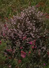 Dans ce type de milieu, l'évolution de la flore est contrôlée : les arbres ne peuvent se développer soit à cause du vent pour les landes littorales, soit à cause de la fauche ou du pâturage extensif dans les landes intérieures. Ces dernières sont aujourd'hui les plus menacées et ne sont conservées que grâce à leur entretien[48]. La lande se compose principalement de bruyères (Erica ciliaris ou bruyère ciliée et Erica tetralix[52]), d'ajoncs et de genets ainsi que de droséras (plantes carnivores). Les tourbières sont nombreuses, celles des touls (dépressions humides) bien sûr, la principale étant celle du Yeun Elez, mais aussi de nombreuses tourbières de crêtes ; la tourbe fut longtemps utilisée par les habitants de la région comme moyen de chauffage. Elle résulte de la décomposition de la matière organique. En raison de la position atlantique des tourbières, elles possèdent une végétation spécifique[53]. Par exemple, l'ajonc de Le Gall[54] qui domine dans les landes des monts d'Arrée n'est fréquent qu'à l'ouest. La spécificité de ce massif est particulièrement d'être le réservoir principal de la sphaigne de la Pylaie[54], et d'abriter près de 70 % de la population française connue d'une très rare orchidée protégée inféodée aux tourbières acides : le malaxis des tourbières[54] (orchidée rarissime, Orchidaceae), dite aussi orchis (quelques centaines de pieds). L'asphodèle d'Arrondeau, plante très rare et menacée, est également présente à Berrien.