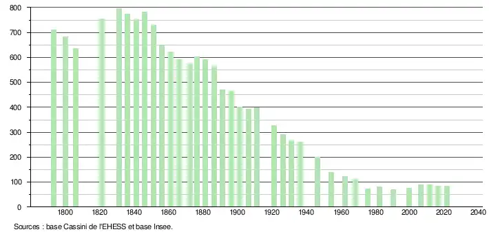 L'évolution du nombre d'habitants est connue à travers les recensements de la population effectués dans la commune depuis 1793. Pour les communes de moins de 10 000 habitants, une enquête de recensement portant sur toute la population est réalisée tous les cinq ans, les populations légales des années intermédiaires étant quant à elles estimées par interpolation ou extrapolation[20]. Pour la commune, le premier recensement exhaustif entrant dans le cadre du nouveau dispositif a été réalisé en 2006[21].