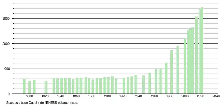 L'évolution du nombre d'habitants est connue à travers les recensements de la population effectués dans la commune depuis 1793. Pour les communes de moins de 10 000 habitants, une enquête de recensement portant sur toute la population est réalisée tous les cinq ans, les populations légales des années intermédiaires étant quant à elles estimées par interpolation ou extrapolation[35]. Pour la commune, le premier recensement exhaustif entrant dans le cadre du nouveau dispositif a été réalisé en 2004[36].