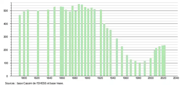 L'évolution du nombre d'habitants est connue à travers les recensements de la population effectués dans la commune depuis 1793. Pour les communes de moins de 10 000 habitants, une enquête de recensement portant sur toute la population est réalisée tous les cinq ans, les populations légales des années intermédiaires étant quant à elles estimées par interpolation ou extrapolation[14]. Pour la commune, le premier recensement exhaustif entrant dans le cadre du nouveau dispositif a été réalisé en 2008[15].