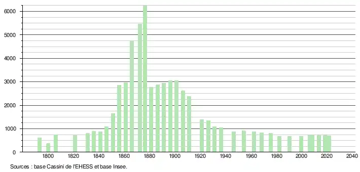 L'évolution du nombre d'habitants est connue à travers les recensements de la population effectués dans la commune depuis 1793. Pour les communes de moins de 10 000 habitants, une enquête de recensement portant sur toute la population est réalisée tous les cinq ans, les populations légales des années intermédiaires étant quant à elles estimées par interpolation ou extrapolation[18]. Pour la commune, le premier recensement exhaustif entrant dans le cadre du nouveau dispositif a été réalisé en 2008[19].