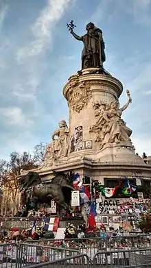 À la suite des attentats de janvier et novembre 2015 à Paris, le monument fait office de mémorial où divers objets sont disposés[23]. Recouvert de graffitis pendant Nuit debout et les manifestations contre la loi Travail, il est vidé et nettoyé en [24].