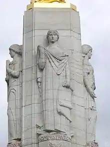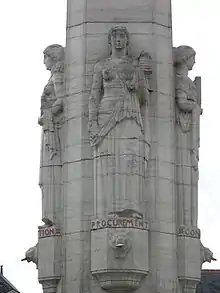 - Au-dessus de cette dernière s’élève un large pilier tétragonal sur lequel sont sculptées quatre figures féminines, allégories des quatre principaux services dispensés par les « Services of Supply » : Procurement, Construction, Administration et Distribution.
