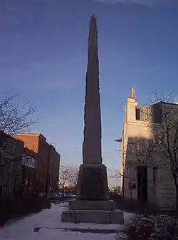 C'est l'architecte-arpenteur J.-A.-U. Baudry, membre de la Société historique, qui conçoit le monument sous la forme d'un obélisque de 9 mètres de haut en granite posé sur un piédestal quadrangulaire orné de quatre plaques de bronze, sur lesquelles sont gravés les noms des principaux pionniers du Canada. L'ensemble du monument s'élève à plus de 12 mètres de hauteur et pèse 17 tonnes. Quarante chevaux furent nécessaire pour traîner l'obélisque jusqu'à son piédestal.