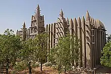 - La Grande mosquée de Mopti, d'architecture soudanaise et appelée communément mosquée de Komoguel, a été construite entre 1933 et 1935 sur l’emplacement d’une précédente mosquée érigée en 1908. Mesurant 31 mètres de long sur 17 de large, elle est bâtie en briques et recouverte de banco (terre crue). Sa restauration a débuté en 2004 grâce au financement accordé par la Fondation Aga Khan (en) (Aga Khan Foundation, AKF) pour la culture (AKTC). La restauration doit se terminer en . La grande mosquée a été inscrite à l'inventaire des biens culturels du Mali du ministère de la Culture le [9].