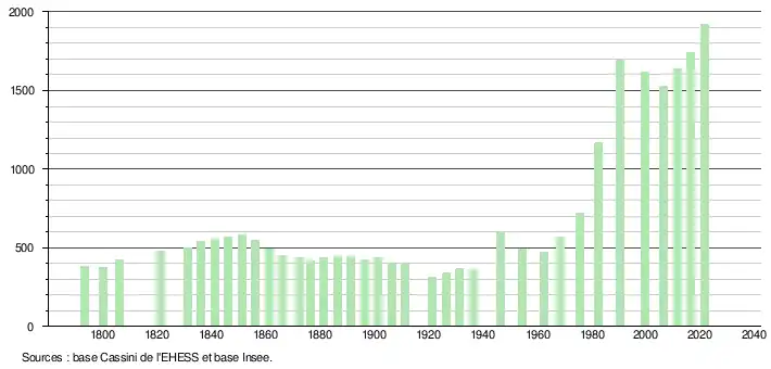 L'évolution du nombre d'habitants est connue à travers les recensements de la population effectués dans la commune depuis 1793. Pour les communes de moins de 10 000 habitants, une enquête de recensement portant sur toute la population est réalisée tous les cinq ans, les populations légales des années intermédiaires étant quant à elles estimées par interpolation ou extrapolation[27]. Pour la commune, le premier recensement exhaustif entrant dans le cadre du nouveau dispositif a été réalisé en 2006[28].