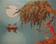 Mordecai Moreh a une habile tendance à la caricature et généralement pour une forme de fantastique teinté d'humour[22]. Ce fantastique est très présent, voire oppressant, dans son œuvre pictural, il explique : « Mes tableaux sont des visions qui s'imposent à moi. Elles font même plus que s'imposer, elles m'envahissent et me possèdent comme des forces contraignantes inévitables[23]. »