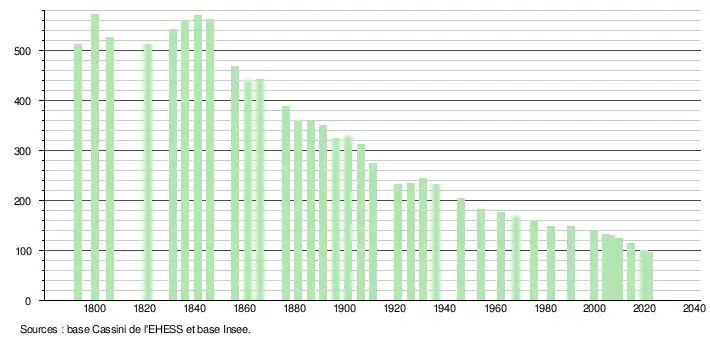 L'évolution du nombre d'habitants est connue à travers les recensements de la population effectués dans la commune depuis 1793. Pour les communes de moins de 10 000 habitants, une enquête de recensement portant sur toute la population est réalisée tous les cinq ans, les populations légales des années intermédiaires étant quant à elles estimées par interpolation ou extrapolation[18]. Pour la commune, le premier recensement exhaustif entrant dans le cadre du nouveau dispositif a été réalisé en 2004[19].
