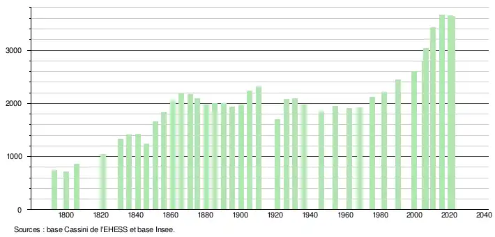 L'évolution du nombre d'habitants est connue à travers les recensements de la population effectués dans la commune depuis 1793. Pour les communes de moins de 10 000 habitants, une enquête de recensement portant sur toute la population est réalisée tous les cinq ans, les populations légales des années intermédiaires étant quant à elles estimées par interpolation ou extrapolation[30]. Pour la commune, le premier recensement exhaustif entrant dans le cadre du nouveau dispositif a été réalisé en 2005[31].