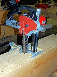 L'outil est une chaîne tronçonneuse à l'extrémité arrondie. Elle opère en général verticalement mais il existe des modèles horizontaux. La largeur de coupe peut être modifiée en adaptant des guides de différentes largeurs (30 à 80 mm), avec des coupes d’onglet jusqu’à 60°. En version portative, cette machine s’adapte très facilement sur les pièces à usiner et est très utilisée dans le domaine de la menuiserie et surtout par les charpentiers pour l’usinage d’assemblages des grosses pièce de charpente.