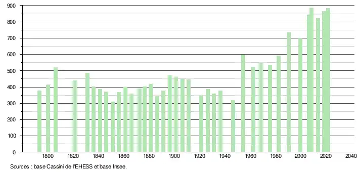 L'évolution du nombre d'habitants est connue à travers les recensements de la population effectués dans la commune depuis 1793. Pour les communes de moins de 10 000 habitants, une enquête de recensement portant sur toute la population est réalisée tous les cinq ans, les populations légales des années intermédiaires étant quant à elles estimées par interpolation ou extrapolation[42]. Pour la commune, le premier recensement exhaustif entrant dans le cadre du nouveau dispositif a été réalisé en 2008[43].
